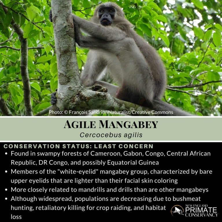 Nationally, agile mangabeys are partially protected in Cameroon, the Democratic Republic of the Congo, and the Republic of Congo. Unfortunately, they are not listed in Gabon’s protected species list, although their list is currently being revised. Furthermore, by Presidential Decree, the hunting, sale, and consumption of primates is forbidden in Equatorial Guinea.