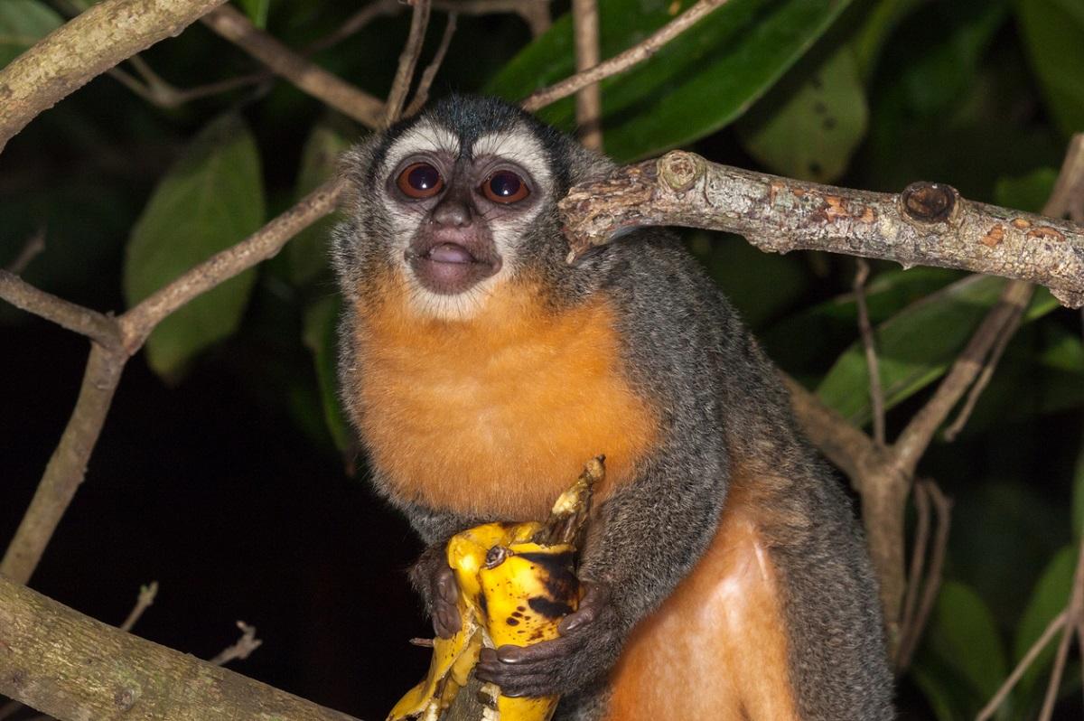 Primarily frugivores, fruit makes up a majority of a night monkey’s diet. They have been observed eating a variety of foods ranging from leaves to flowers and nectar to insects. Some of their preferred fruits (and leaves) come from ficus (figs), chrysophyllum, and bastard cedar trees. Their dietary choices often depend on what is most readily available in different seasons and forest regions. During the dry season, when fruit becomes less abundant, they consume more leaves, particularly those of ferns and lianas. Monkeys living in areas with limited availability of fruits, such as the tropical Chaco of Paraguay, rely more heavily on leaves.