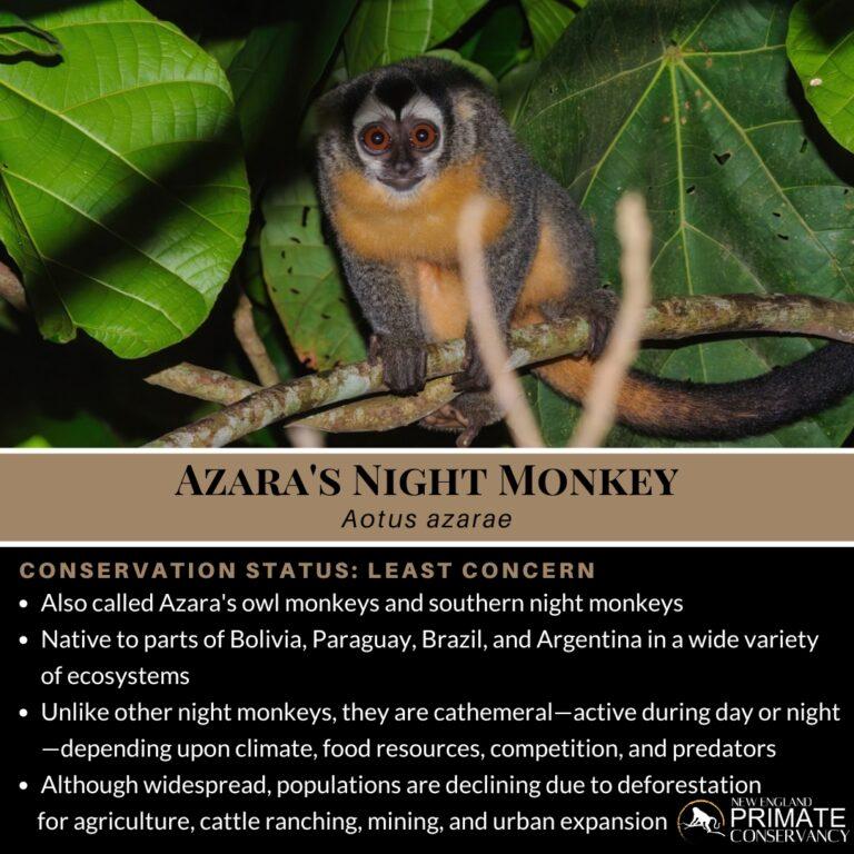 The Owl Monkey Project (Azara’s night monkeys are also known as Azara’s owl monkeys), established in 1996, is a broad initiative focused on advancing research and conservation efforts for this species.