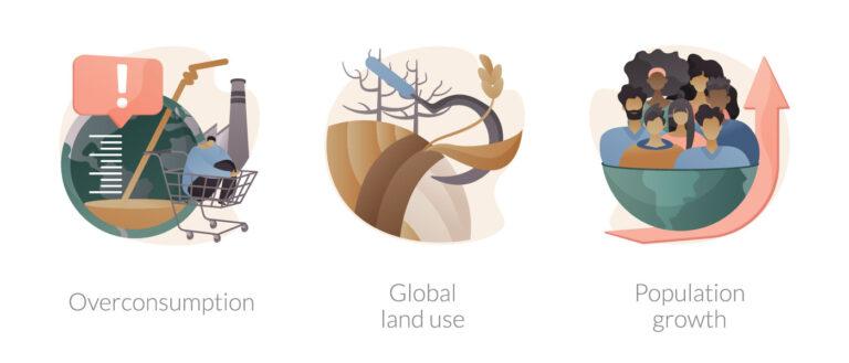 - Conversion of natural ecosystems to farmland to produce more crops, and the building of urban environments to live in.