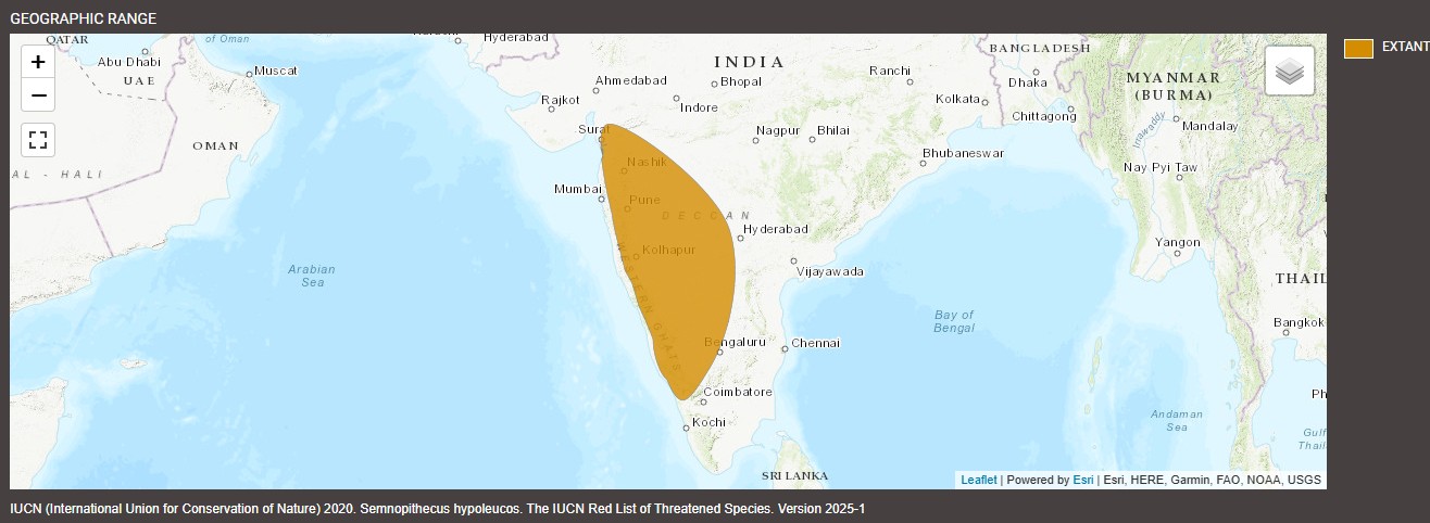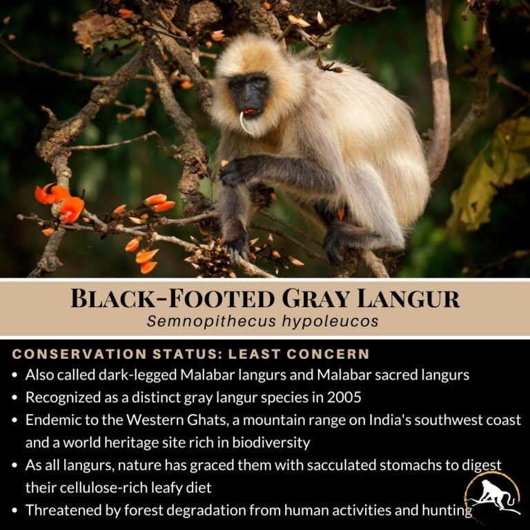 Black-footed gray langurs (Semnopithecus hypoleucos), also called dark-legged Malabar langurs or Malabar sacred langurs, are monkeys native to India. They are distributed across many territories, including Goa, Karnataka, Kerala, Andhra Pradesh, and Maharashtra. Found in a variety of ecosystems, they live at elevations between 328 to 3,937 feet (100 to 1,200 meters). Their ecosystems include tropical rainforests, moist deciduous forests, sacred groves, riparian forests, etc.