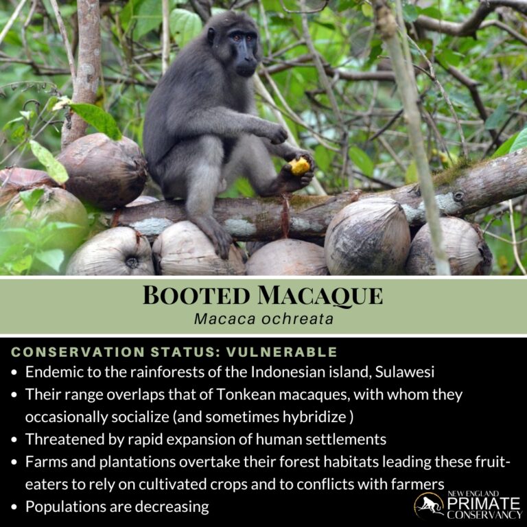 The booted macaque is listed as Vulnerable by the International Union for Conservation of Nature (IUCN, 2015) appearing on the IUCN’s Red List of Threatened Species.