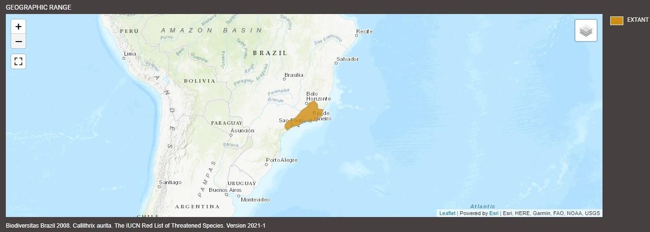 Though there have been many discrepancies and unconfirmed information regarding the range of this species, their geographical boundaries are generally as follows: In Minas Gerais, the species has been recorded living north of the Rio Muriaé in Rio Doce State Park, as well as hybrids between them and the buffy-headed marmoset occurring at Carangola in the Serra do Brigadeiro. Their northern limit appears to be Minas Gerais’s Rio Piracicaba, with Rio Doce being their southernmost boundary in the state. In East Rio de Janeiro, the buffy-tufted-ear marmoset is confined to the tops of the slopes of the Serra do Mar, though they can be found nearly at sea level in the southern part of the state. Their southernmost occurrence is that of São Paulo, and while specifics are confirmed, it is generally believed that they reside only north of the junction of the Rios Pinheiros and Rio Tietê.