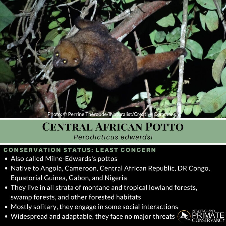 The Central African Potto is classified as Least Concern by the IUCN (2016), appearing on the IUCN Red List of Threatened Species. While these monkeys are considered common and widespread, their populations are declining—particularly in the species’ eastern range—due to habitat destruction. But the IUCN has not yet deemed a higher threat category necessary, citing “no evidence of significant range-wide population decline.”