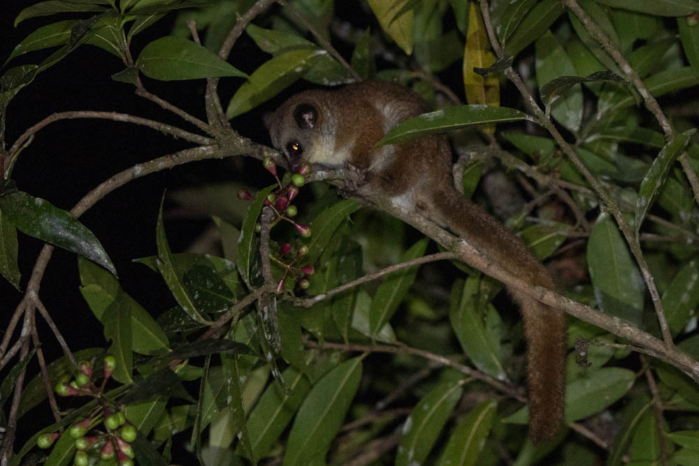 Dwarf lemurs’ small size makes them vulnerable to predation by carnivores like Madagascar’s endemic fossas and native ring-tailed mongooses, so they have developed several adaptations and behaviors to help them remain hidden. Key to this strategy, known as ‘crypsis,’ is their (mostly) solitary lifestyle. While many primates adopt a safety-in-numbers approach, traveling and foraging in large groups, this tends to make them more conspicuous—larger and louder. In contrast, cryptic species like dwarf lemurs minimize the risk of drawing attention to themselves by choosing to forage alone.