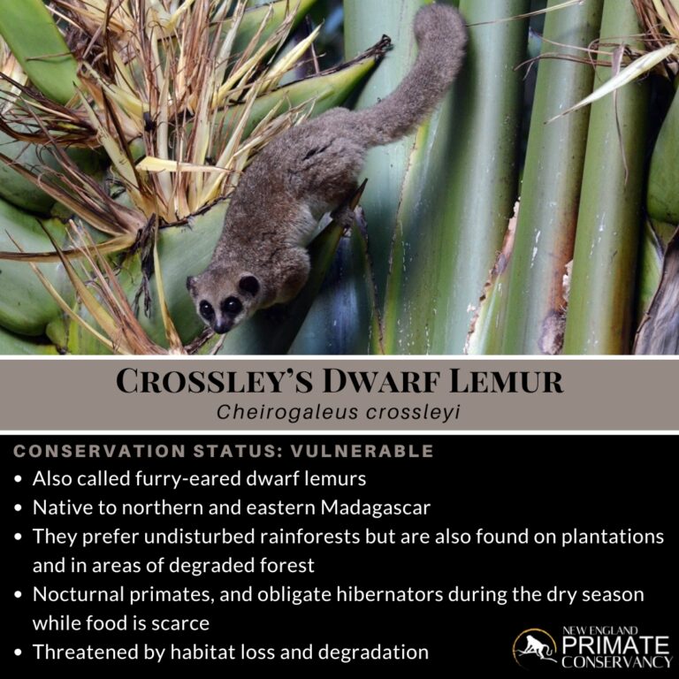 The Crossley’s dwarf lemur is classified as Vulnerable by the International Union for Conservation of Nature (IUCN, 2020) and appears on the IUCN Red List of Threatened Species.
