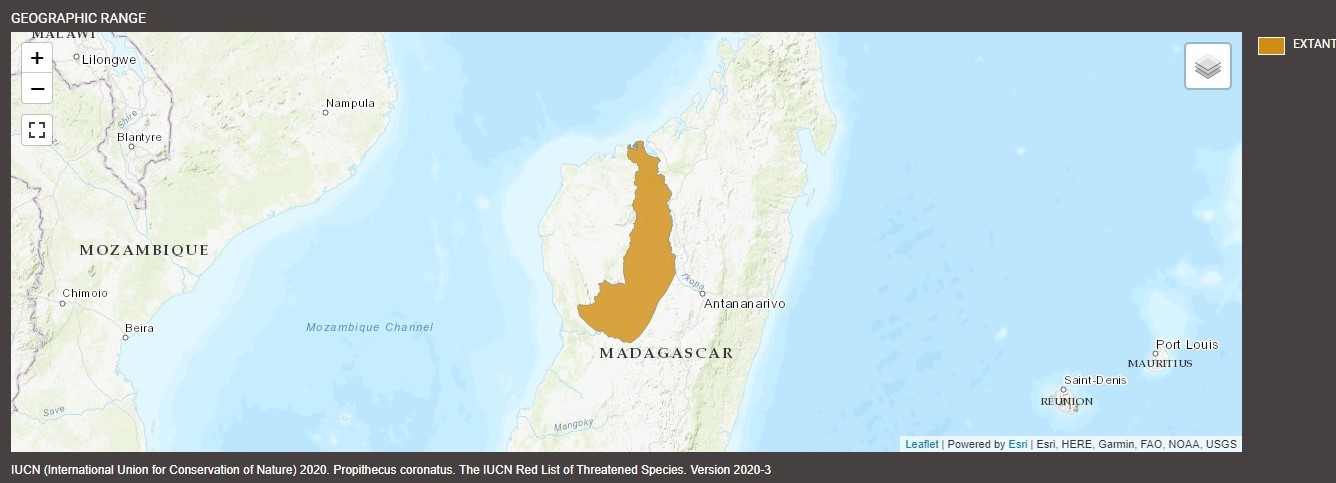 Crowned sifakas are endemic to (meaning only found in) western and western-central Madagascar. Their habitat is severely fragmented; a word which in conservation biology means what was once an extensive forest is now broken into small fragments with little to no connection between them, resulting in the limitation of access to food sources and new mating opportunities for species living in these forests.