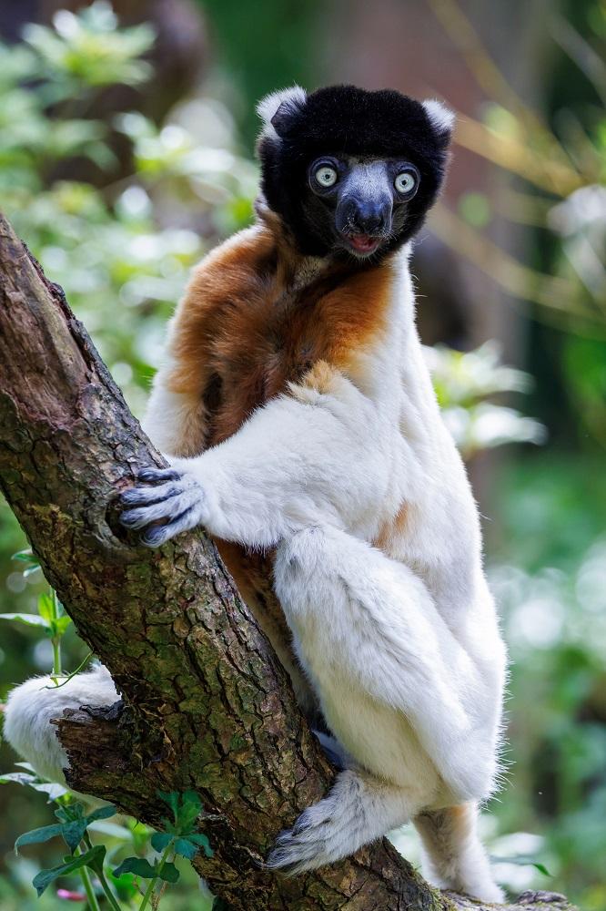 Crowned sifakas are covered in dense fur, starting with the stark black fur covering their heads, broken only by their white ear tufts and light green or golden eyes. The fur on their chest and belly (or in science speak, their ventral side) is a deep rusty red color, which bleeds into the creamy white fur that covers the rest of their body. They have long hands and feet, perfect for wrapping around tree branches, and have a more robust nose compared to other sifakas.