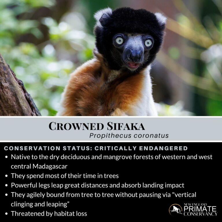 Crowned sifakas are known to live alongside brown lemurs, mongoose lemurs, and the Antafia sportive lemur. They tend to tolerate other lemur species—especially the ones that are more frugivorous (fruit-eating) and don’t pose as competition to their diets.