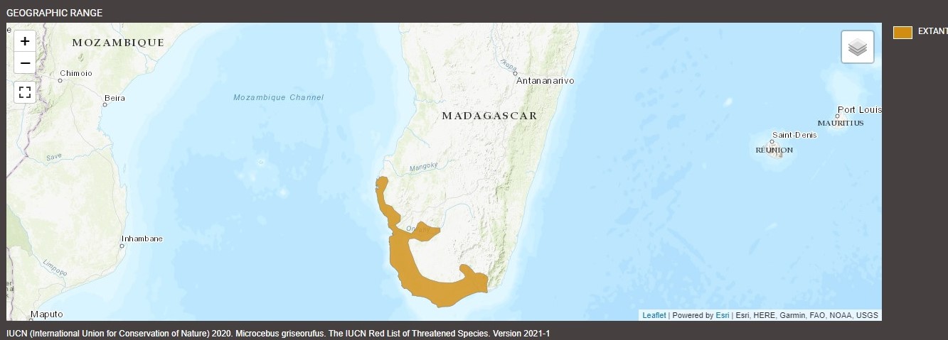 The gray-brown mouse lemur is classified as Least Concern by the International Union for Conservation of Nature (IUCN, 2018), appearing on the IUCN Red List of Threatened Species. While considered a fairly common species, their populations are reported as decreasing due to the risk of habitat loss from logging for coal production and agricultural development. Fortunately, the habitat loss that has occurred in the gray-brown mouse lemur’s range hasn’t caused severe fragmentation, meaning their populations are not separated from each other or potential food sources. While gray-brown mouse lemurs are used to particularly warm and dry climates, scientists predict that the impact of climate change on habitats that are better suited for high temperatures and low rainfall such as the spiny bush where the gray-brown mouse lemur is found may be pushed past their limits.