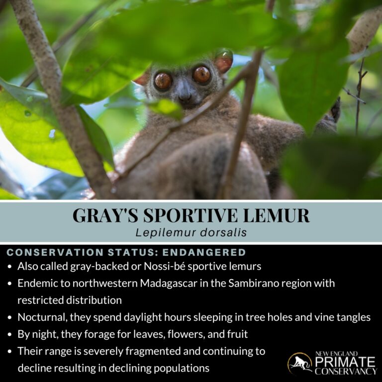 Gray’s sportive lemurs are classified as Endangered (IUCN, 2019) on the International Union for Conservation of Nature’s Red List of Threatened Species.