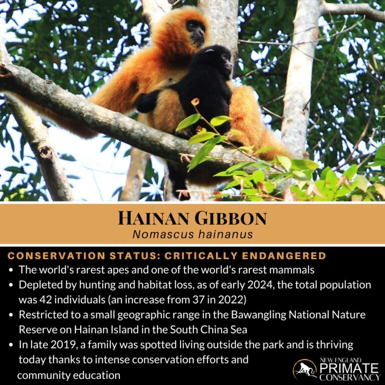 The Hainan gibbon has the ignoble distinction of being the world’s most Critically Endangered ape and has appeared multiple years, most recently 2016–2018, on the listing of “Primates in Peril–World’s Top 25 Most Endangered Species.” (Endangered species are routinely dropped from this listing, not because their situation has improved, but to focus attention on other species who also have “bleak prospects of survival.”)