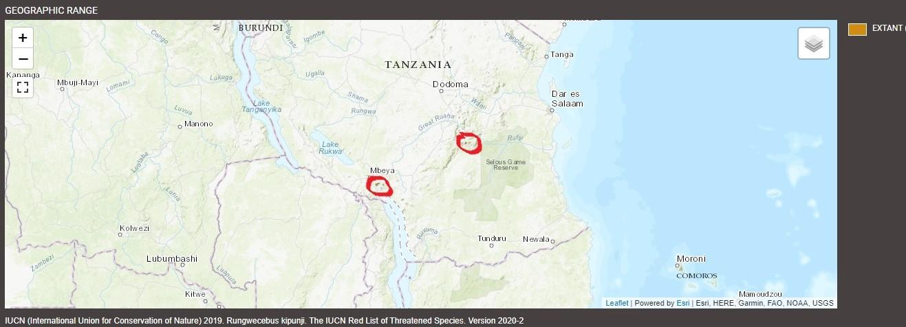 Kipunjis are monkeys found only in Tanzania, living in two distinct populations separated by roughly 217.5 miles (350 km) of largely unforested land. One small population lives in the Ndundulu Forest in the Udzungwa Mountains of south-central Tanzania. The larger population, with 90% of all kipunjis, inhabits the Rungwe-Livingstone forest complex in the southwest. This complex includes the submontane forests of Mount Rungwe and Livingstone, which are connected by a narrow, degraded patch known as the Bujingijila Corridor.