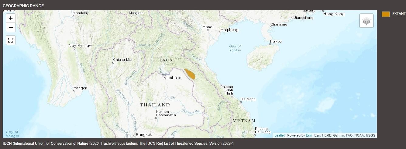 The Laotian langur, also called the Lao langur or Lao leaf monkey, is endemic to the Lao People’s Democratic Republic (Lao PDR). They are found in the Bolikhamxai and Khammouan provinces, in rugged terrain and dry rainforests. They live in several protected areas, including the Nam Kading National Protected Area, Nam Sanam Provincial Protected Area, and Phou Hinpoun National Protected Area. In Phou Hinpoun National Protected Area, they share their forested habitat with the Hatinh langur (Trachypithecus hatinhensis), and there is some overlap in appearance. Because of this, their habitat boundary is not strictly known in this area.