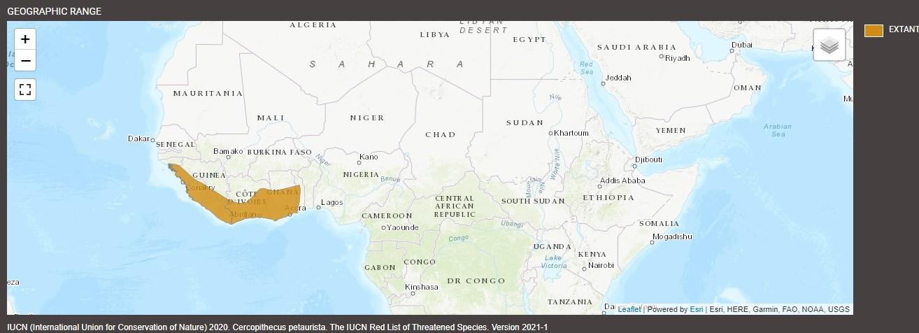 Tropical rainforests and woodlands that include primary, secondary, gallery, swamp, and mangrove forests, along with forest-savanna mosaic landscapes, coastal scrublands, and farm bush, provide habitat to this adaptable species. The guenons frequent the top layer of the forest understory, at times venturing upward into the canopy like those residing within Täi National Park, Côte d’Ivoire, where individuals have been spotted at elevations of 44 ft (13.3 m). The highest elevation recorded for the species is 3,281 ft (1,000 m) on Mt. Bintumani, within old-growth primary rainforests of Sierra Leone’s Loma Mountains.