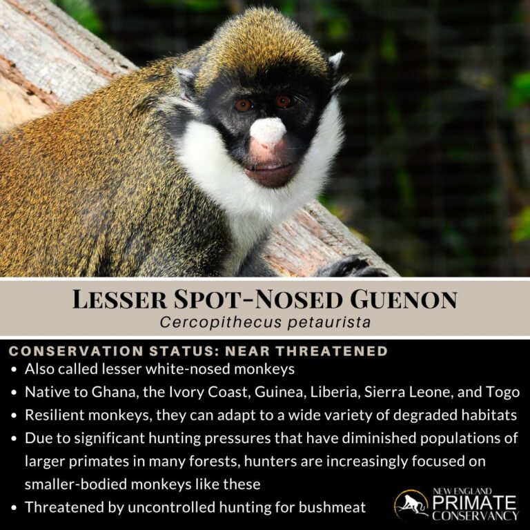 The primary threat against these primates is hunting. While subsistence hunting occurs in some areas, it’s the illegal bushmeat trade, now a major international industry, driving the species’ decline. With the expansion of logging roads into the forest, hunters have easy access to these primates. After having killed so many of the larger-bodied primates in the region (including colobus monkeys and mangabeys), these unscrupulous hunters have placed the much smaller-bodied guenons in their crosshairs. Today, lesser spot-nosed guenons are the most “harvested” of all primate species in their region.