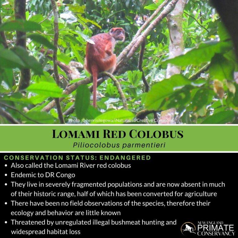 The International Union for Conservation of Nature lists the Lomami red colobus as Endangered (IUCN, 2017) appearing on the IUCN’s Red List of Threatened Species. This assessment is based on a predicted population loss of more than 50% over the next 30 years. It is believed there are less than 2,500 Lomami red colobuses remaining today. The main threats to Lomami red colobuses include rampant habitat loss and unregulated hunting.