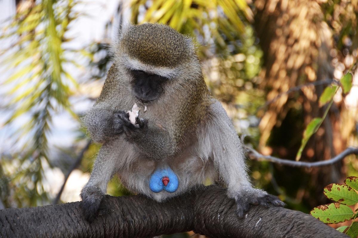 Both sexes bear the bluish abdominal skin that marks them as members of the Chlorocebus lineage, but males have lapis blue scrotal skin and red penises that vividly broadcast their sexual maturity, health, and rank. Researchers have found that those with higher androgen levels tend to have more blue scrotal coloration, while higher-ranking males display more luminant and saturated red penises.