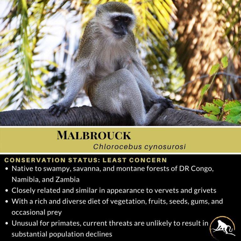 Native to central and southern Africa, malbrouck monkeys (Chlorocebus cynosuros) are medium-sized primates that inhabit a wide range of wooded and open environments. Malbroucks carry many common names, including African green monkey and savanna monkey, though they are often misidentified as “vervets” or “grivets”—terms that technically refer to related species (Chlorocebus pygerythrus and Chlorocebus aethiops, respectively).