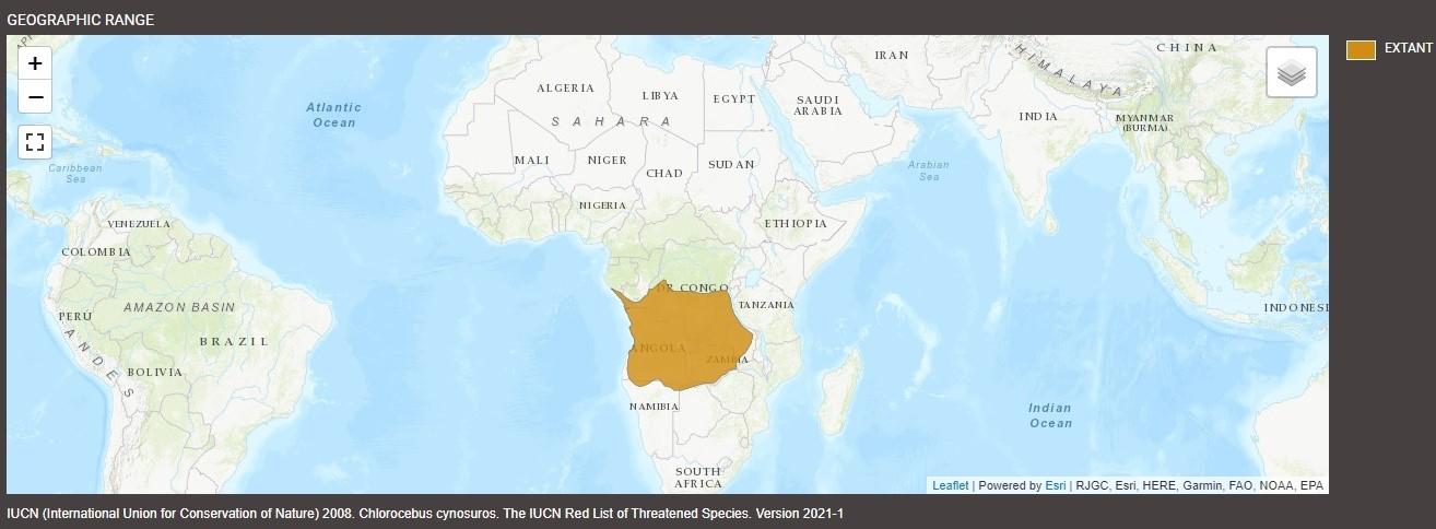 Indigenous to Angola, western Zambia, southern Democratic Republic of Congo, northern Namibia, and northern Botswana, their populations possibly extend into southern Gabon. The Zambezi River basin marks their southernmost boundary, while the Luangwa River serves as a consequential biogeographic barrier, maintaining the evolutionary separation between western populations from eastern species like vervets, which do not occur west of the East African Rift or the river.