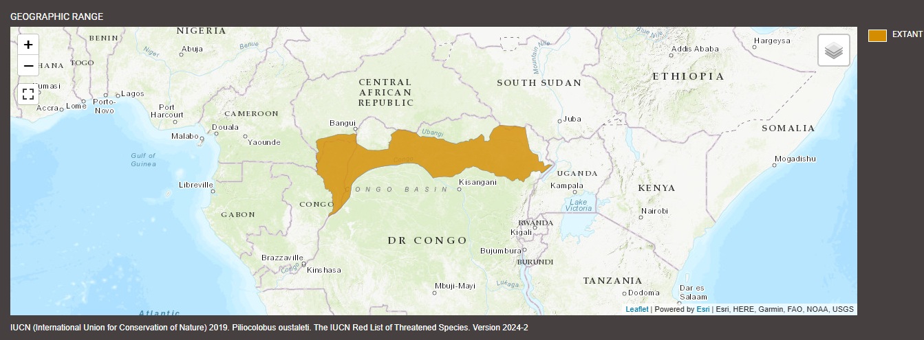 The Oustalet’s red colobus, also known scientifically as Piliocolobus oustaleti, is a monkey present in the Democratic Republic of Congo, the Republic of Congo, the southwest regions of the Central African Republic, as well as in small numbers in South Sudan. The borders of their habitat lie in the eastern forest above Lake Albert, the northern Uélé River, the southern Aruwimi (Ituri) River, and the Congo River until it connects with the Sangha River, and the western Sangha River until it reaches the savannah forest.