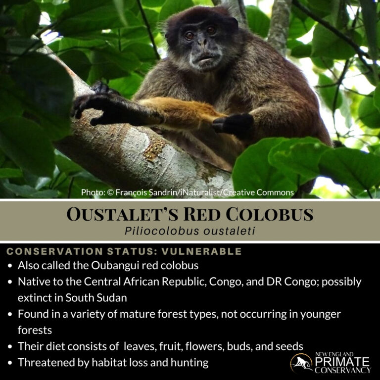 The Oustalet’s red colobus is listed as Vulnerable by the International Union for Conservation of Nature (IUCN, 2018), appearing on the IUCN Red List of Threatened Species.