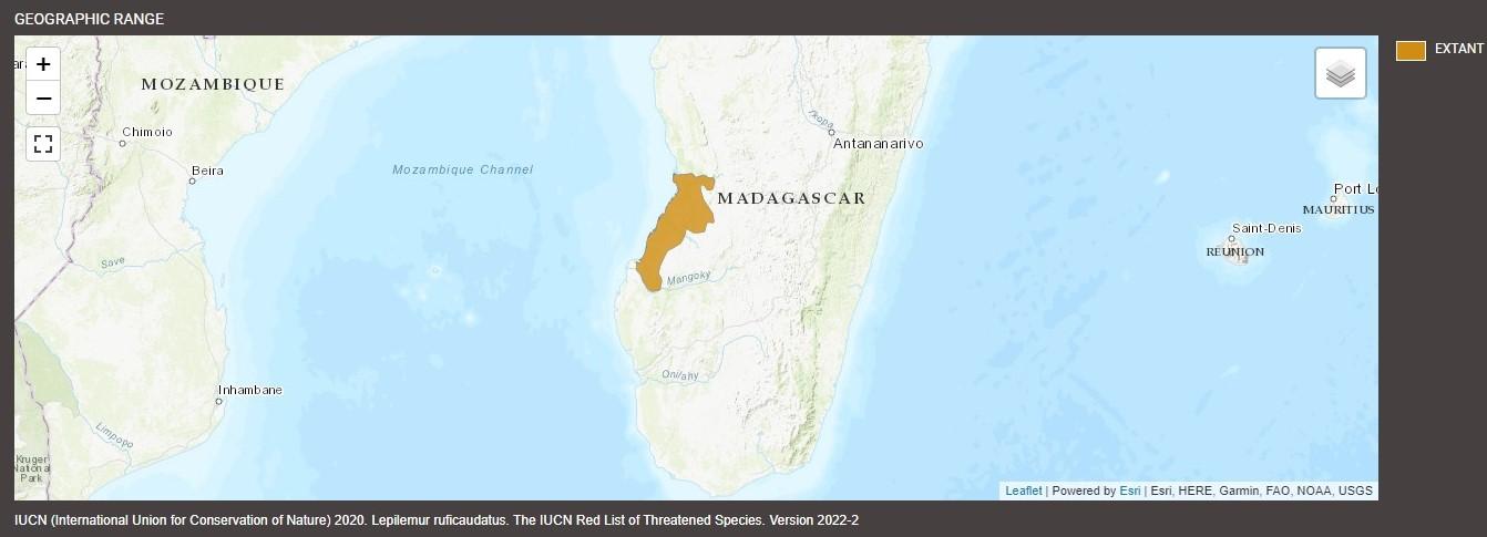 Red-tailed sportive lemurs are found living throughout the central coastal and western parts of Madagascar in subtropical dry lowland deciduous forests, gallery forests, and bush. Between 1973 and 2014, Madagascar lost 37% of its forest cover, and continues to be deforested at an annual rate of 1.1%. Although much of their habitat is destroyed, the lemurs still occur in Kirindy Mitea National Park, between the Morondava and Tsiribihina Rivers, and south between the Kambatomena and Mangoky Rivers. Red-tailed sportive lemurs have a lower elevation limit of 42.7 feet (13 meters) and an upper elevation limit of about 157.5 feet (48 meters). Furthermore, they have a home range at or below 2.47 acres (one hectare), which is about the size of two soccer fields.