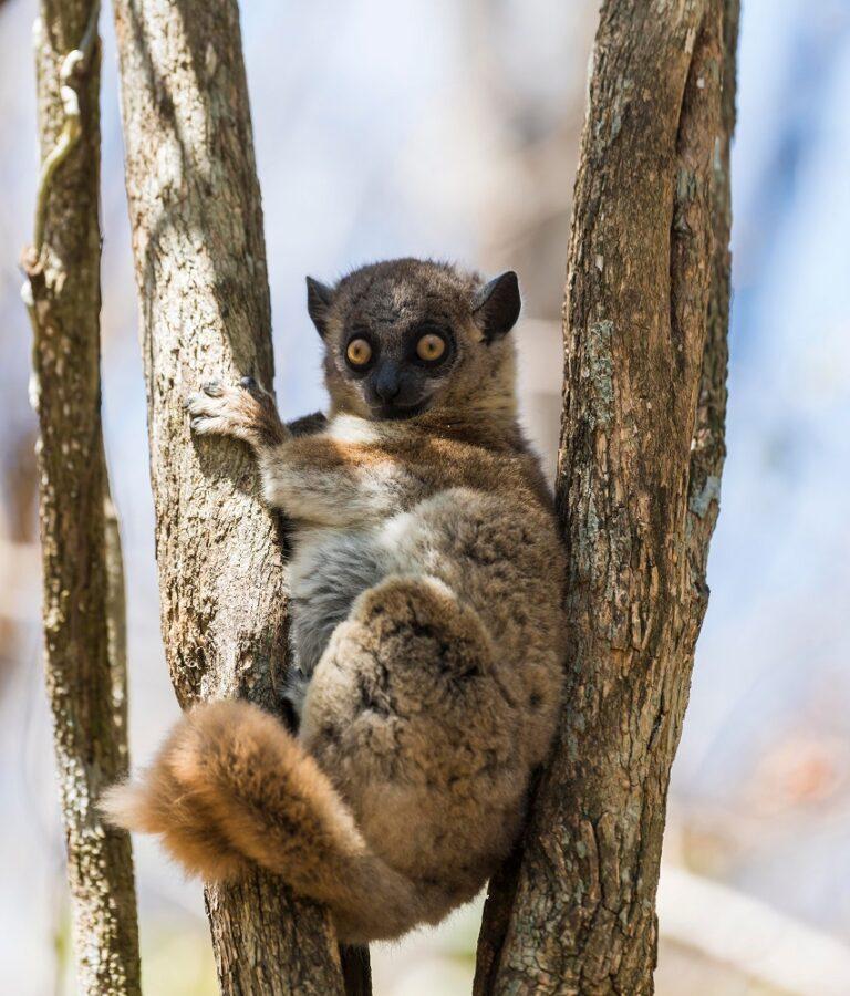 Appearing as if it were dipped in paint, the tail of red-tailed sportive lemurs is tipped with a beautiful brownish-red color. The tail assists them with balance and acts as a counterweight to stabilize the body. For example, when red-tailed sportive lemurs move throughout a forest habitat, their tail may swish back and forth, moving in the opposite direction to their body’s movements. Ultimately, this movement stabilizes their center of gravity so that they do not have to worry about falling to the ground. To find the best complementary angle to the body, other tail movements include whipping or rotating from left to right.