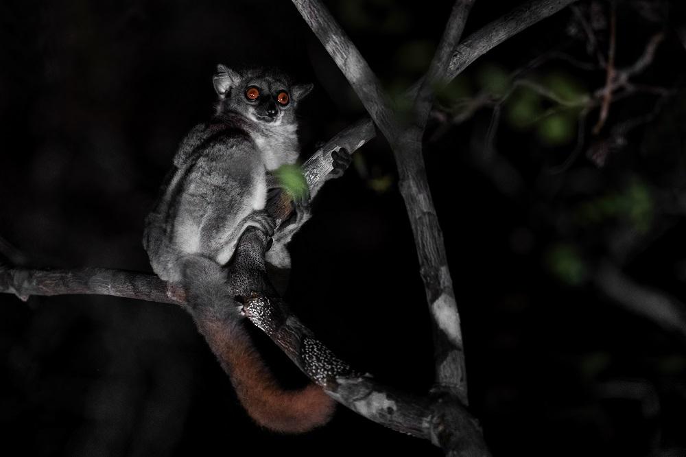 All known sportive lemur species are nocturnal, and the red-tailed sportive lemur is no exception. Nocturnal primates are most active after dusk and before dawn, particularly when the moonlight begins to crest over the horizon, muting the colors of the day. Red-tailed sportive lemurs are arboreal (tree-dwelling), so shortly after sunset, they emerge from their sleeping sites to begin their daily activities. Sleeping sites, which include tree holes and hollows, offer essential protection from predators and provide comfort when they sleep, especially because the site often allows them to regulate their internal body temperature.