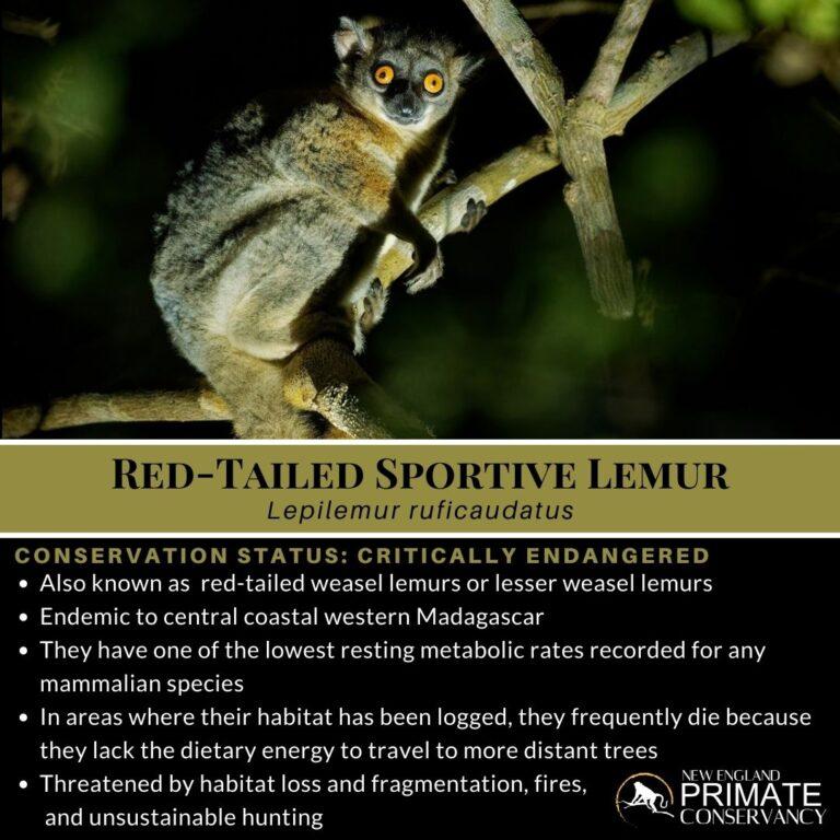 The red-tailed sportive lemur is listed in Appendix I of the Convention on International Trade in Endangered Species (CITES), an international agreement between governments whose goal is to ensure that international trade in specimens of wild animals and plants does not threaten their survival.