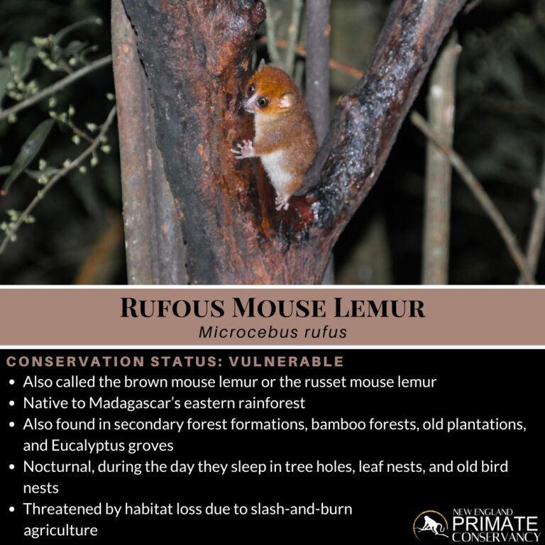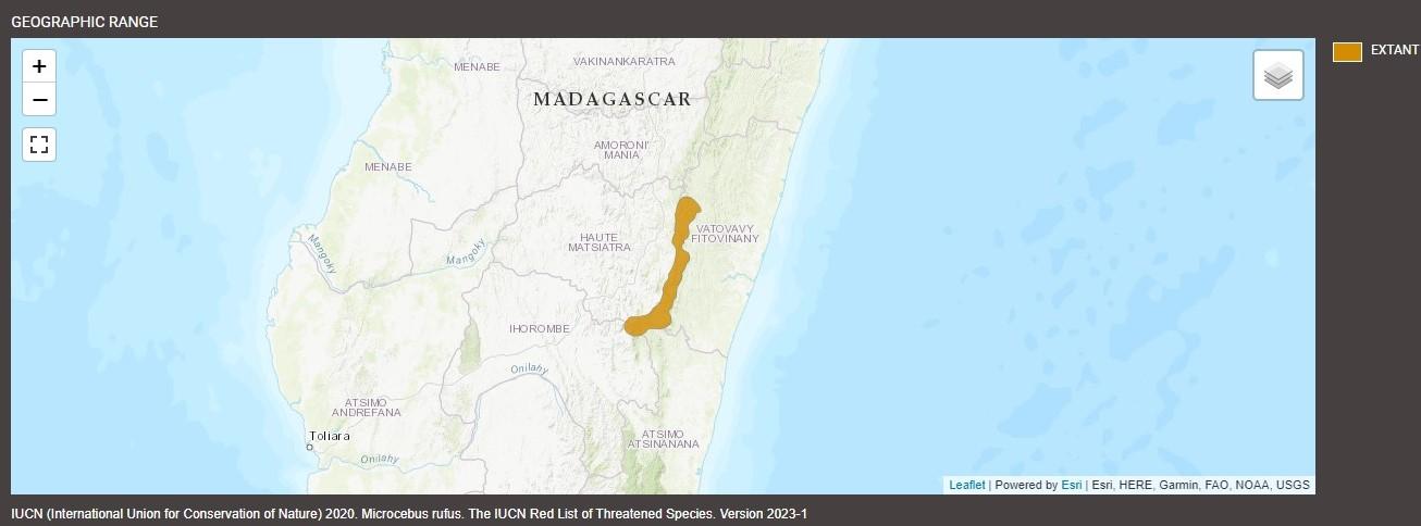 The International Union for Conservation of Nature lists the rufous mouse lemur as Vulnerable (IUCN, 2017) appearing on the IUCN’s Red List of Threatened Species. The small area of extant that rufous mouse lemurs occupy is subject to slash-and-burn agriculture and other forms of habitat loss that has resulted in a severely disjointed and fragmented network of habitat patches.