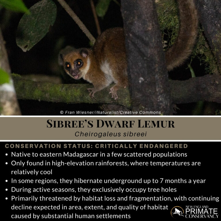 The Sibree’s dwarf lemur is arboreal, depending on trees and shrubs for travel, foraging, and nesting. Ongoing deforestation has fragmented the forest and sharply reduced the availability of suitable habitat, cutting off the remaining populations from each other and putting the species at even greater risk.