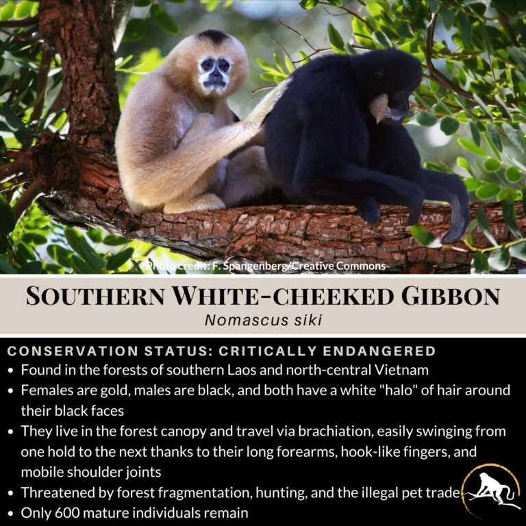 Hunting represents a bigger issue for the southern white-cheeked gibbons in Laos than habitat loss, but little is done to curb this trend other than strict enforcement of gun laws. Thanks to certain political and economic interests, forest conversion is currently on the rise in this country, and if efforts are not made to reverse these trends, the country’s gibbons may soon face a similar situation as those in Vietnam do today.