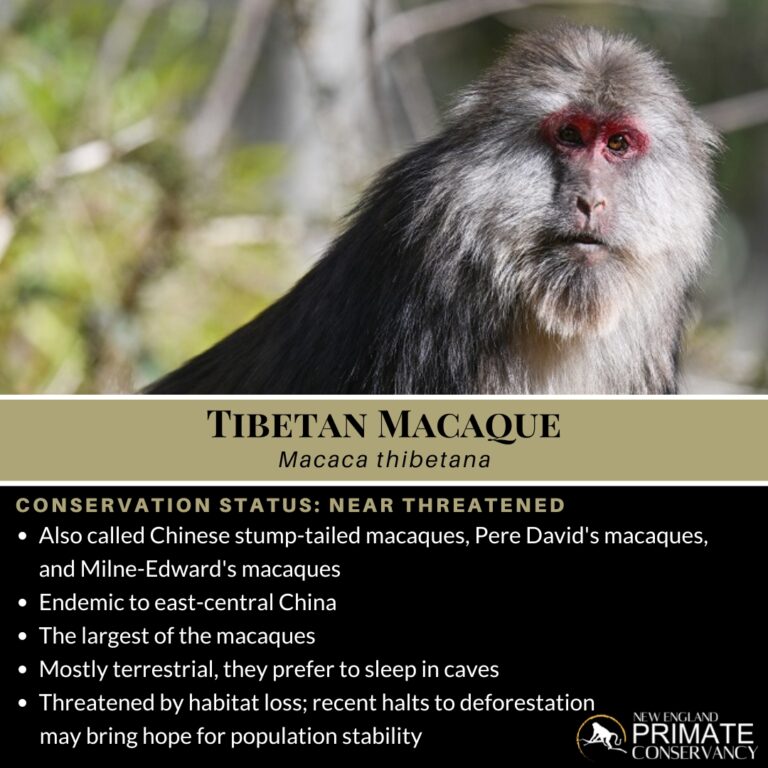 The Tibetan macaque is classified as Near Threatened by the International Union for Conservation of Nature (IUCN, 2015), appearing on the IUCN Red List of Threatened Species. Significant habitat loss has been threatening the species for the last 30 years. Fortunately, deforestation has been decreasing, stabilizing their status.