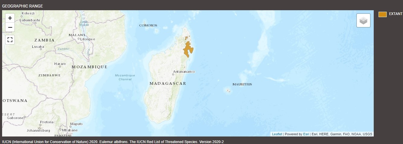 Unconfirmed sightings have been reported south of Mananara. But significant hybridization occurs—over a wide area—between white-fronted lemurs and common brown lemurs (Eulemur fulvus); simply put, the two species mate with one another, resulting in a hybrid animal. Further study is needed to determine whether this region is, in fact, part of the white-fronted lemur’s natural geographic distribution. Wildlife researchers have, however, ruled out the species’ presence on the Makira plateau, where these primates were once believed to live.