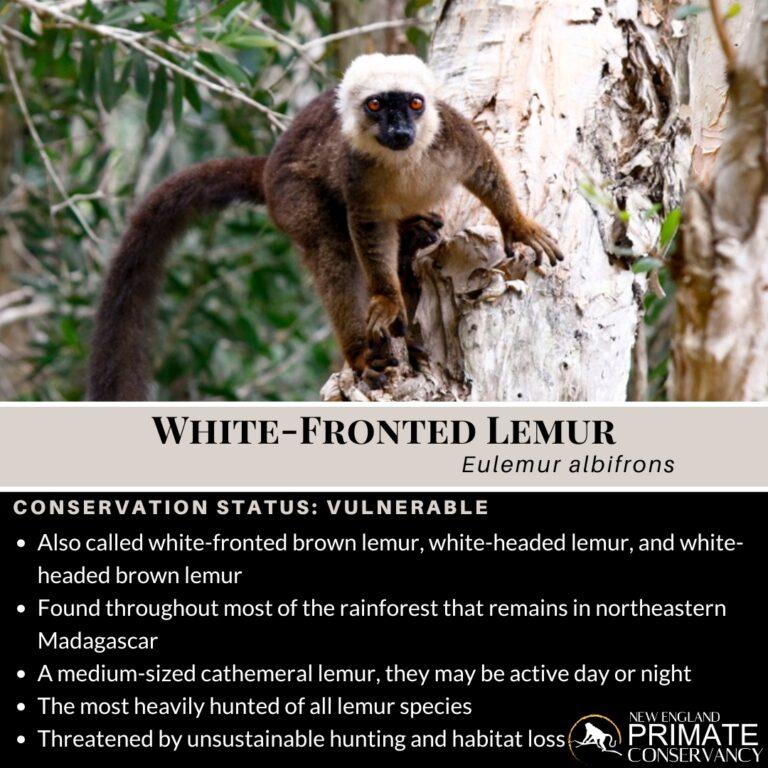 White-fronted lemurs are listed in Appendix I of the Convention on International Trade in Endangered Species (CITES), an international agreement between governments whose goal is to ensure that international trade in specimens of wild animals and plants does not threaten their survival.